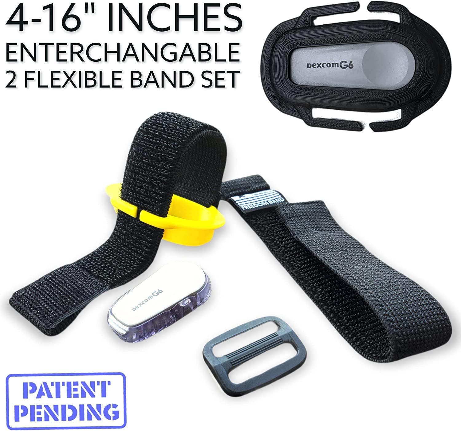 This Freedom Band starter kit includes everything needed to shield and protect your Dexcom G6 from failing adhesive to sudden sennsor removal from activity. The ultimate Dexcom G6 transmitter companion and your on-call wingman to use as needed. Every Freedom Band we create is born with attention to detail, motivated and ready to serve. The multi-length band and patented case design is unique to itself by allowing users to wear and protect their G6 CGM and adhesives, virtually anywhere on the limbs of the body that fit 4-16″ inch diameter where the CGM is recommended. This very special shell cover & band will comfortably flex to about 18″ inches in length. Our one-of-a-kind sleek design provides a secure sensor / transmitter lock-in and holds the G6 transmitter and adhesive to the body. We’ve even left a window for your favorite decorative decals. No 2nd band clasp or extra loose band to overlap and mess with.This 1″ inch wide Active “Hook & Loop” using Velcro brand materials is designed to fit all limbs of a diabetic warrior who owns the Dexcom G6 and is between 4″ & 16″ inches in diameter with some extra “flexibility” just in case.Sizing is easy. Using a piece of string and tape measure, wrap the string around the area you wish to use the Freedom Band. Wrap around the arm and lay the string on a ruler or tape measure to check your size. If you are within 4-16″ inches diameter with some additional flexibility.With the two bands provided in each order, you can use one to reduce to as small as 4″ inches diameter. Add the 2nd band as shown with the included cinch clip to increase flexibility to 16″ inches and every size in-between.Sizing and use instructional video QR code is included with each purchase on the QR code on the back of the product packaging. Reactivate a loved ones life with peace of mind and freedom of worry free adventure. Custom made in the USA Gift peace of mind.Color & Band Enterchangable- See Video Use Introduction on back of product packaging. Lifetime Warranty. Top & side sensor protection is designed to hold the G6 transmitter to the body and even protects the transmitter on the top from falling out. This is done by adding a 2mm top “lid” with a window for decorative stickers. Patented Safety Snag Release Arms. Unique Hook & Loop Flexible & Adjustable.