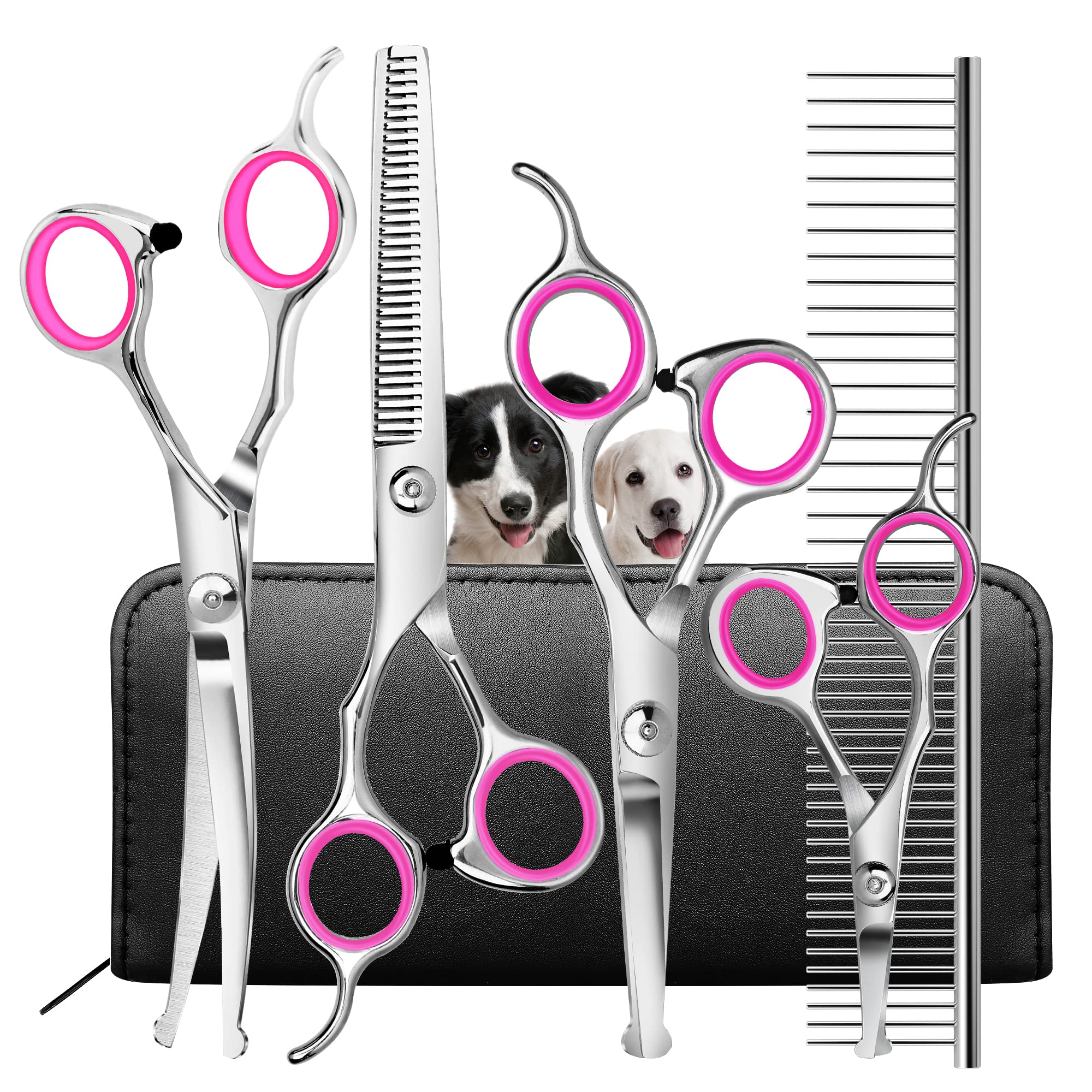 ?Lifetime Warranty ? -We fully trust the quality, durability, and utility of these Pet Gromming Supplies and this is why we offer a lifetime warranty. Time will show that this hair scissors cuts extremely well, it is resistant and it efficiently fulfills its utility. We offer 100% satisfaction or money back. Invest with no risk. ?Mute & Easy To Clean ? :Each pet scissor for dogs has a muffler between the handles which means quiet grooming for your sensitive cat or dog, less scary to your pets. Adjustable screw for tightness or separating blades for sharpening, easy to clean and maintain. ?Ergonomic Design for Comfort ?: The rubber rings on the handle, can avoid harming your fingers and prevent slipping, making it comfortable to hold. It is also removable, for different finger sizes use, a rubber bumper at the handle to prevent accidental clamping of the fingers and avoid making a loud noise to frighten your pet like electric clippers. ?Round-end Tips for Maximum Safety? : Never need to worry about poking your pet’s skin, because all dog scissors for grooming have rounded end tips, especially when trimming sensitive areas (such as the face, ears, eyes, nose, paws). ?Quality Stainless Steel ?: Ecnocal pet grooming scissors are made of high-quality 4CR titanium coated stainless steel with high hardness, the scissors are rustproof and very sharp to use. quickly and easily trim thick long hair, not pulling on the dog’s hair. Specially prepared 4.5 inch round tip straight edge scissors, more suitable to cut puppies and small pet’s hair around eyes and ears.Blade Edge: Straight. Style: Pink. Blade Material: Stainless,Stainless Steel,Titanium,Steel. Brand: Ecnocal. Material: Stainless Steel, Rubber. Date First Available: April 8, 2022. Best Sellers Rank: #21,754 in Pet Supplies. Customer Reviews: 4.7 out of 5 stars 69 ratings4.7 out of 5 stars. : B09YD5Y6DQ. Batteries Required?: ?No. Blade Edge: ?Straight. Material: ?Stainless Steel, Rubber. Style: ?Pink. Package Dimensions: ?9.41 x 4.13 x 1.46 inches. Item Weight: ?14.4 ounces. Part Number: ?KM-809B. Manufacturer: ?Ecnocal.