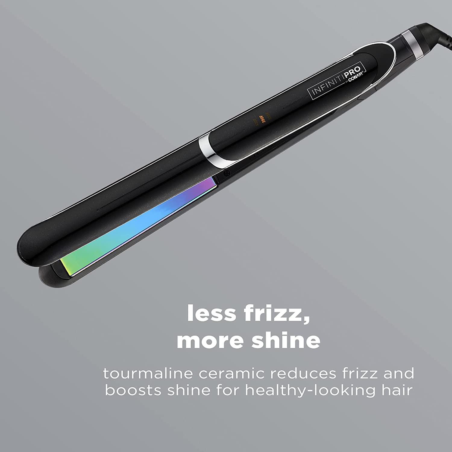 Straighten your hair in one smooth, effortless pass with this powerful flat iron.The InfinitiPro by Conair 1-inch Rainbow Titanium Flat Iron creates shiny, silky, straight hair. Extra-long titanium plates create an easy-glide surface to help you style more quickly and floating plates create better contact with your hair for faster straightening and styling. Use it to straighten or even create a flip or wavy curls with the flick of your wrist.This 1-inch straightening iron has 6 precision heat settings to control the temperature that works best for your hair thickness. And, with 30-second heat-up to an ultra-high 455 degrees F (230 degrees C), you wont be waiting around to style and get out the door.The 1-inch rainbow titanium plates protect your hair from damage and add shine for long-lasting, silky straight hair. The powerful ion generator of this titanium flat iron actively eliminates static and tames frizz for amazing 24-hour control. Simply listen for a soft clicking sound to know your unit is working and the ions are flowing. Imagine what you could do with a full day of silky smooth hair!This hair straightener also has a uniform heat recovery system to help maintain ultra-high heat levels and the true ceramic heater provides instant, even heat-up and recovery.Ever worry that youve left your flat iron on after youve left the house Worry no more! This model features auto-shutoff to turn the straightener off when left on too long.Make a statement with the InfinitiPro by Conair 1-inch Rainbow Titanium Flat Iron.