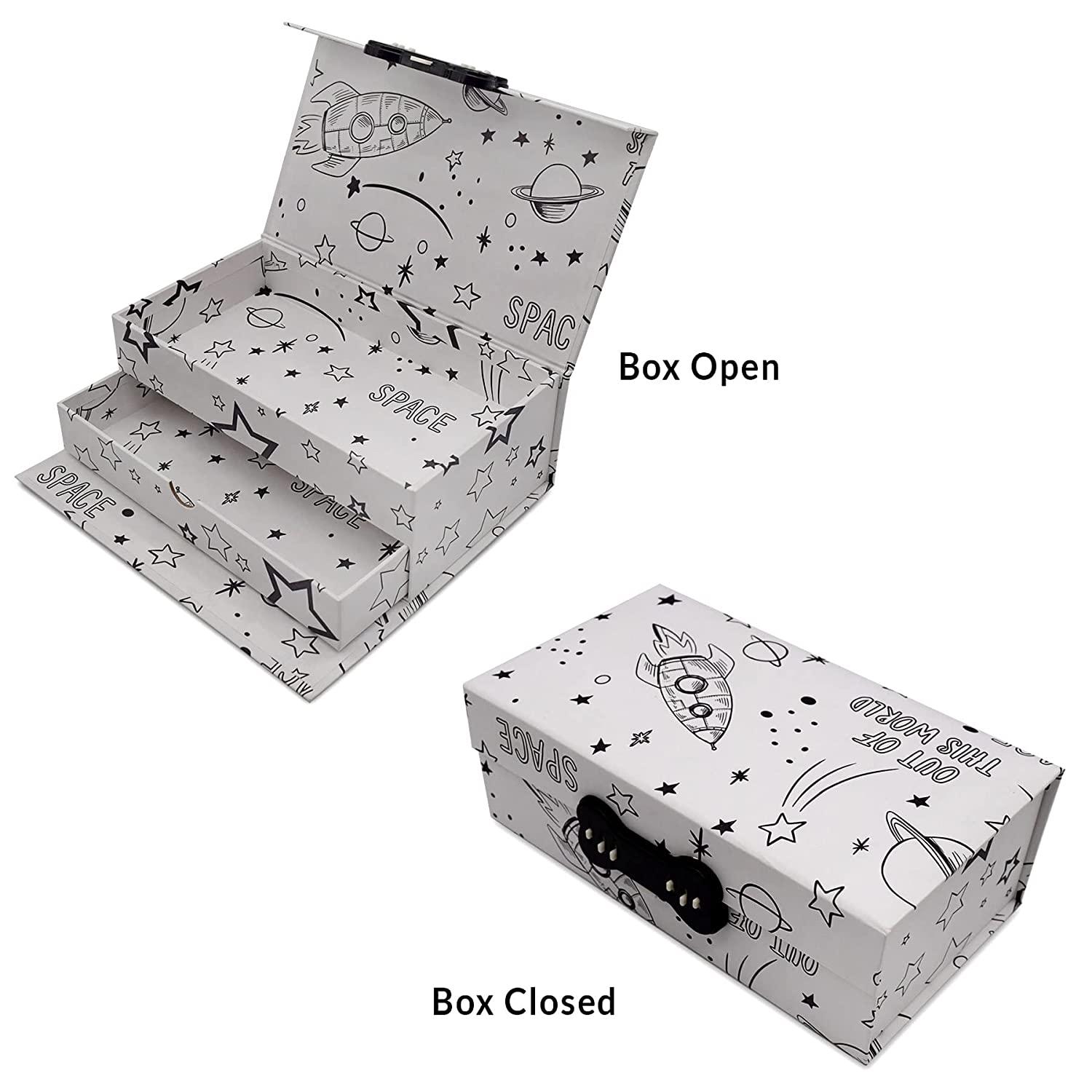 OccasionAll’s rigid setup box with anti-scratch finish for boys is made from high-quality 1,000 GSM board wrapped in premium art paper. These lock boxes are perfect for storing your kids’ personal items. The uncolored space pattern is perfect for boys to color in on their own. Other prints available. The convenient size of the boxes are perfect for accommodating small to medium sized items. Store everything from coins and money to other valuable items Our high-quality boxes with high-quality art paper measures 9.5” W x 5.25” H x 3.5” D and can close and lock with a set combination. (Lock combination sticker on bottom of box.) Coming in a pack of 1. Boxes double as a safe to keep items out of reach and stored away, making it the ultimate multipurpose lock box for kids. Interior of the box has a top tray and pull-out drawer to keep contents safe and organized. Also equipped with a top flap combination lock for added security, our premium boxes provide a tight and secure seal, securing the contents inside. The combination lock makes opening and closing the boxes simple. Once closed and locked, the box secures the items inside. Finally, the high-quality paper ensures these boxes can be reused multiple times. Your kids will have fun coloring in the space pattern and makes storing your kids’ personal items fun. Simply place their belongings in any of the interior drawers or trays and secure the lid. Set the combination to lock, and your items will be safely locked away. To open, put in the combination and unlock the box.GREAT VALUE: The high-quality papers ensure these boxes can be reused multiple times and makes storing your kids’ personal items fun. Your kids can have fun coloring in the space pattern. Simply place their belongings in any of the interior trays and secure the lid. Set the combination to lock, and your items will be safely locked away. To open, put in the combination and unlock the box. COMBINATION LOCK CLOSURE: Equipped with a top flap combination lock for added security, our premium boxes provide a tight and secure seal, securing the contents inside. The combination lock makes opening and closing the boxes simple. Once closed and locked, the box secures the items inside. MULTIPURPOSE USE: Great for storing all your kids’ personal items. Boxes double as a safe to keep items out of reach and stored away. Interior of the box has a top tray and pull-out drawer to keep contents safe and organized. CONVENIENT SIZE: These boxes are perfect for accommodating small to medium sized items. Store everything from coins and money to other valuable items. Our high-quality boxes with uncolored space pattern measures at 9.5” W x 5.25” H x 3.5” D and can close and lock with a set combination. (Lock combination sticker on bottom of box.) Coming in a pack of 1. RIGID BOX WITH UNCOLORED SPACE PATTERN: Made from high-quality 1,000 GSM board wrapped in premium art paper, these lock boxes are perfect for storing your kids’ personal items. The uncolored space pattern is perfect for boys to color in on their own. Other prints available.Number of Items: 1. Number of Compartments: 1. Number of Drawers: 1. Shape: Rectangular. Target Audience: Unisex. Special Feature: Lock. Material: Paper. Brand: OccasionALL. Color: White. Best Sellers Rank: #36,461 in Baby. Customer Reviews: 4.5 out of 5 stars 2 ratings4.5 out of 5 stars. : B09T719B3C. Country/Region of origin: ?China. Item Weight: ?14.4 ounces. Batteries required: ?No. Number Of Items: ?1. Additional product features: ?Lock. Material Type: ?Paper. Target gender: ?Unisex. Item model number: ?850030581389. Package Dimensions: ?9.88 x 5.94 x 3.62 inches.