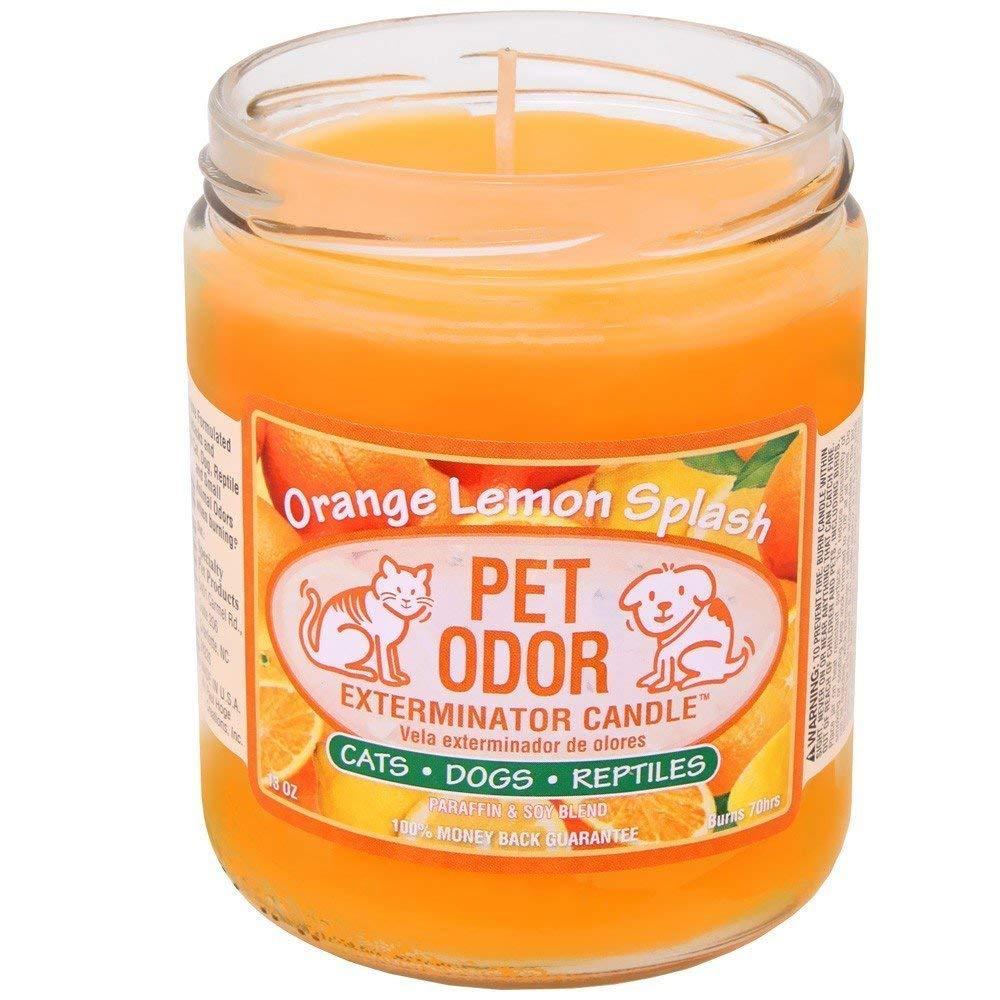 The Pet Odor Exterminator Candles ; remove pet odors from the air while leaving a pleg scent behind. Specialty Pet Products features world famous odor exterminator candles and wax melts that attack and eliminate pet odor using an enzyme based formula. These products are used in thousands of veterinarian offices, pet stores and millions of homes around the world, providing customers with an enjoyable solution to pet odor concerns. Pet Odor Exterminator ; products remove odor from litter boxes, general animal smells, and even helps with the smell of cigarette smoke and human odors! The 13oz Jar candle has an average burn time of 70 hours. Make sure to keep your wicks trimmed down and burn for 3-4 hours at a time to extend the life of the candle. Made in the U.S.A.Average burn time is 70 hours to keep it smelling fresh. No more smelling the litter box, wet dog or even cigarette smoke. Enzyme based formula attacks and eliminates odor. Remove pet and human odors in the home.Import Designation: Made in USA. Batteries Required?: No. Is Discontinued By Manufacturer: No. Best Sellers Rank: #15,188 in Pet Supplies. Customer Reviews: 4.4 out of 5 stars 1,135 ratings4.4 out of 5 stars. Item model number: Orange Lemon Splash. : B000O3BFSY. Manufacturer: Specialty Pet Products. Item Weight: 1.4 pounds. Product Dimensions: 3.25 x 3.25 x 4.25 inches. Unit Count: 1 Count. Indoor/Outdoor Usage: Outdoor, Indoor. Size: 13oz. Are Batteries Included: No. Package Information: Jar. Wick Quantity: 1. Occasion: Work. Specific Uses For Product: Scent. Scent: Orange Lemon Splash. Material: Soy Blend Wax, Paraffin Wax. Operating Time: 70 Hours. Product Dimensions: 3.8″W x 3.8″H. Item Weight: 1.4 Pounds. Color: Orange Lemon Splash. Brand: Pet Odor Exterminator.